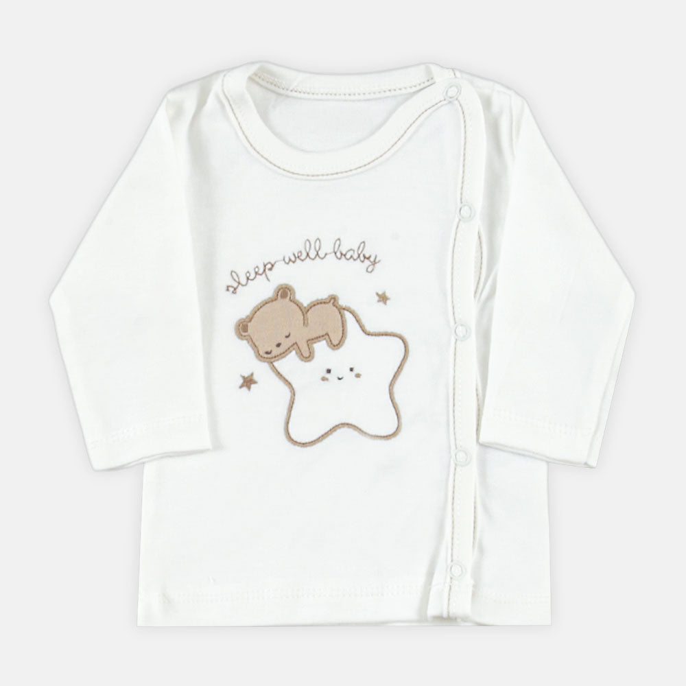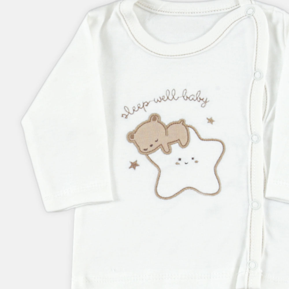 Shirt: Side-snap closure to make changing simple for mom and restful for baby. Displays a bear above a star and the words sleep well baby