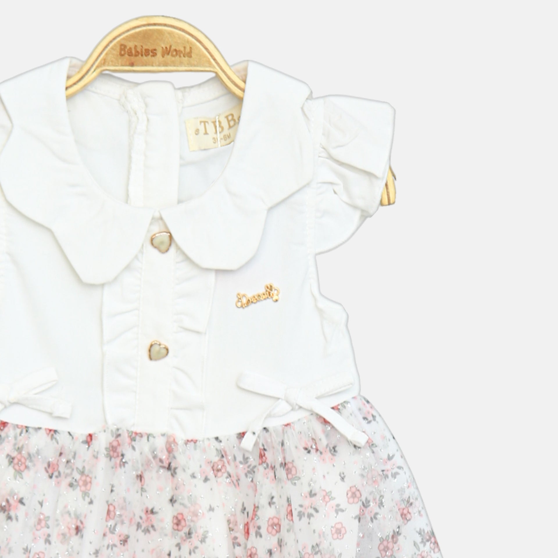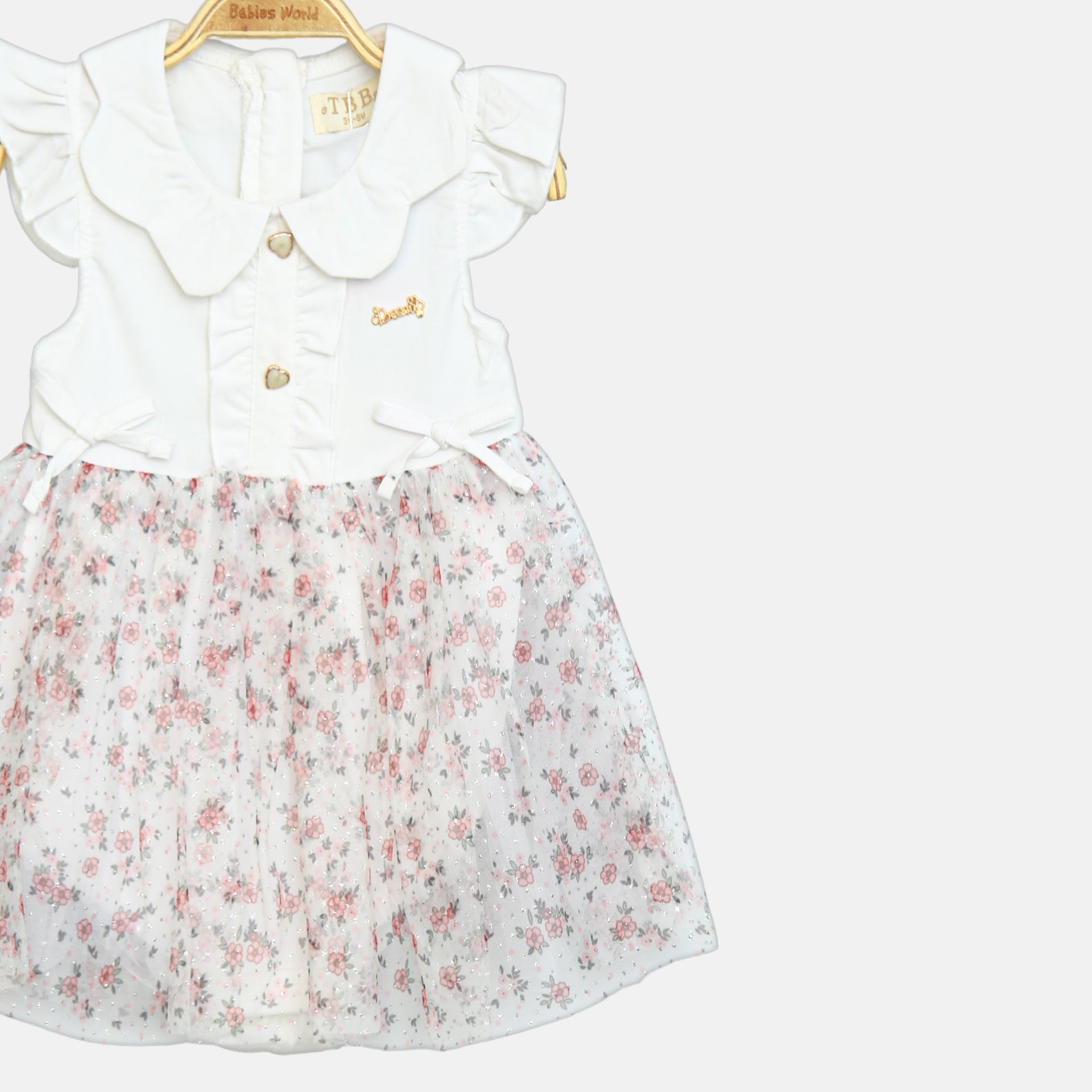 Detail: Glittery tulle skirt overlay with a pink floral pattern