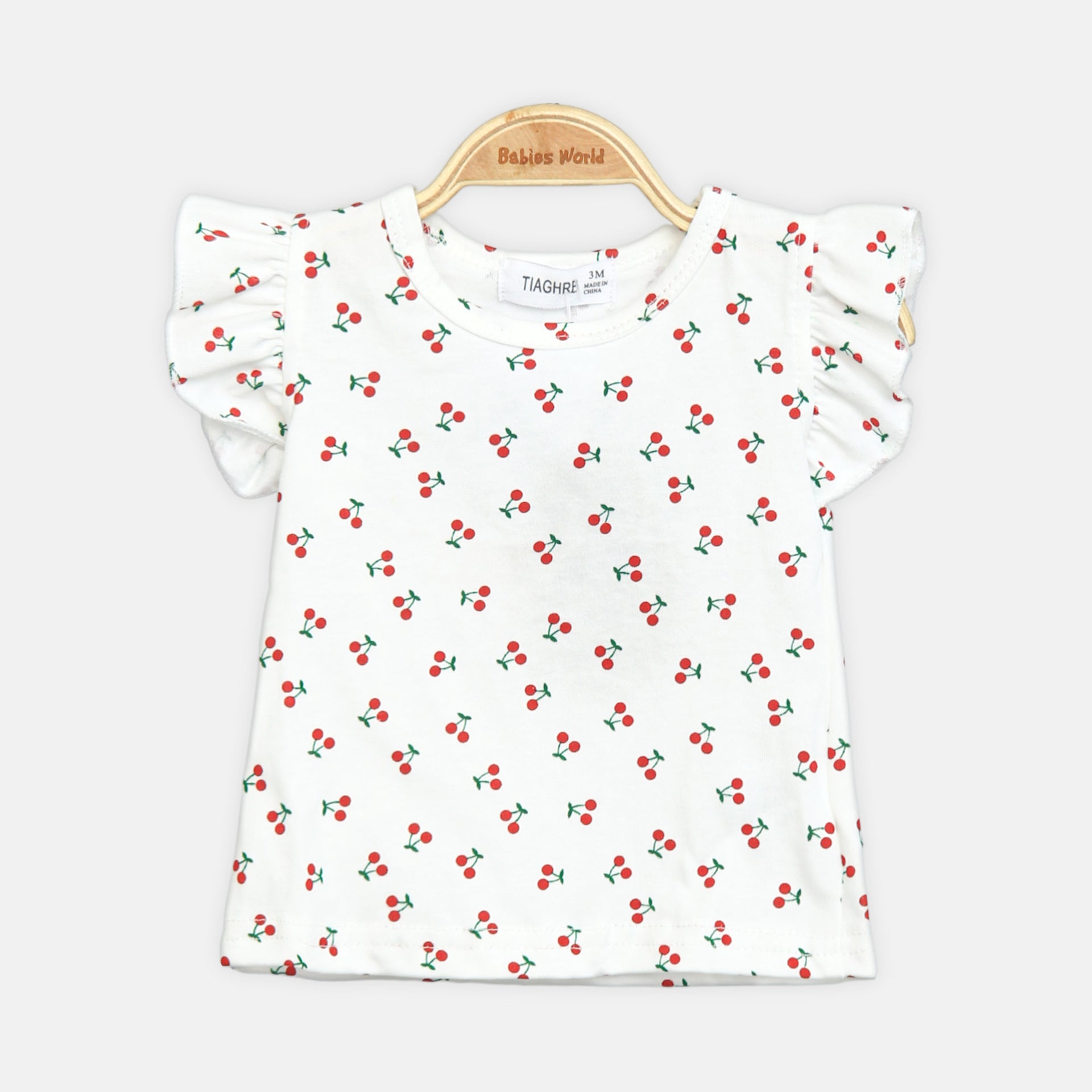 Top: White short-sleeved blouse with an all-over red cherry print and ruffle sleeves