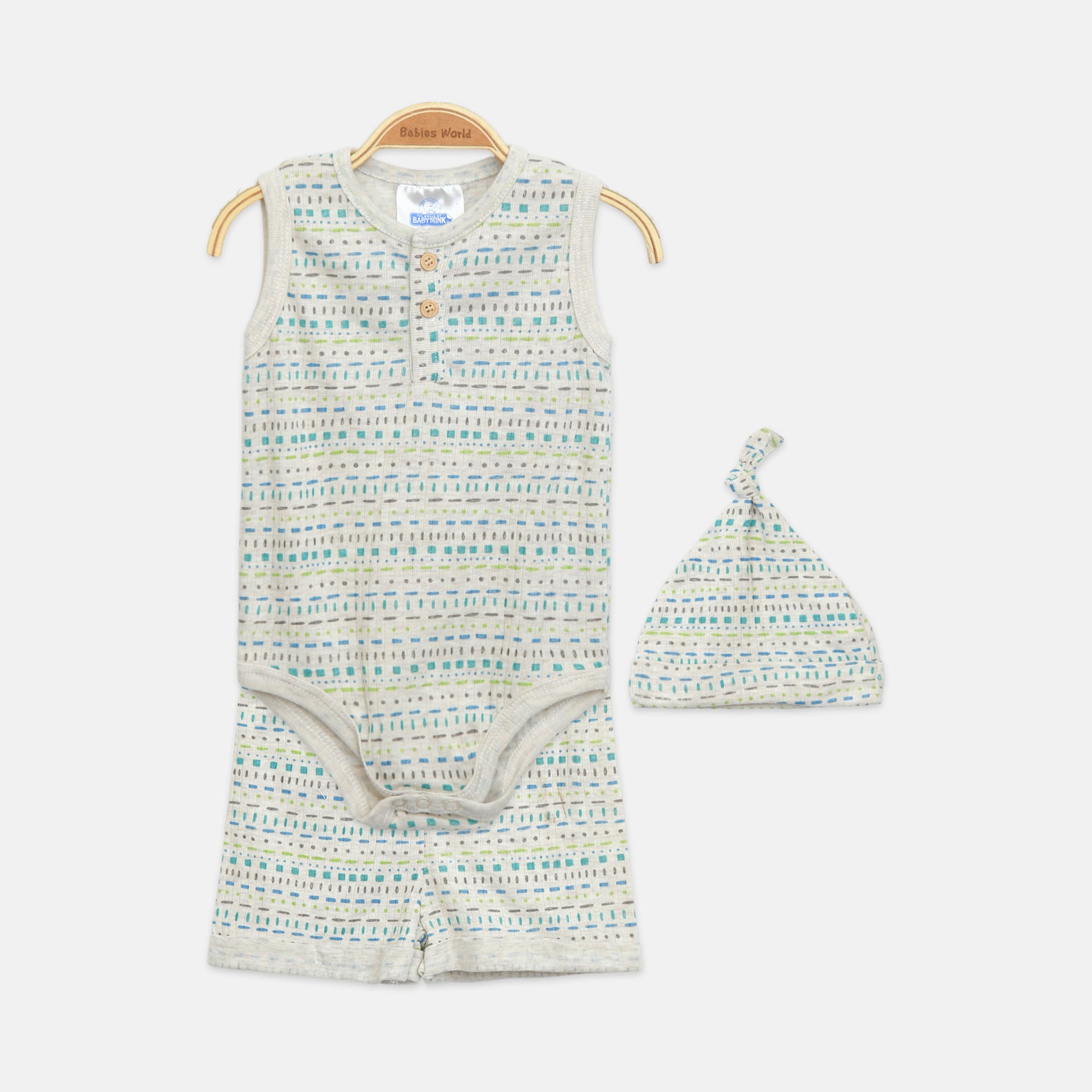 Items: Sleeveless bodysuit, elastic-waist shorts, and matching bandana.