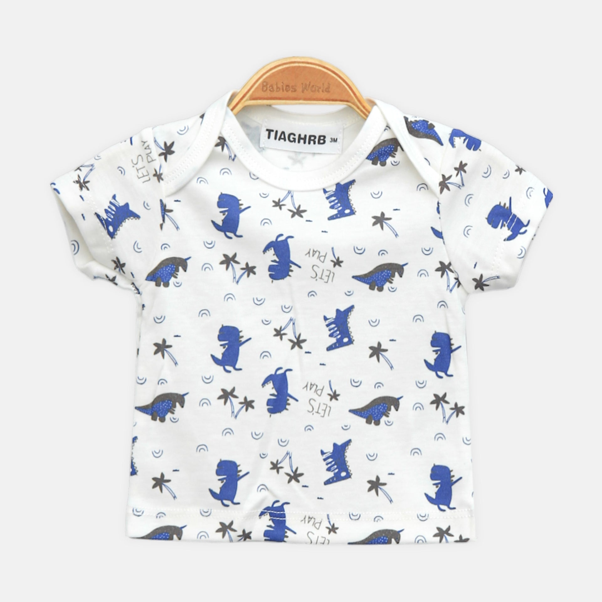 Top: White short-sleeved t-shirt with an all-over navy and blue dinosaur print