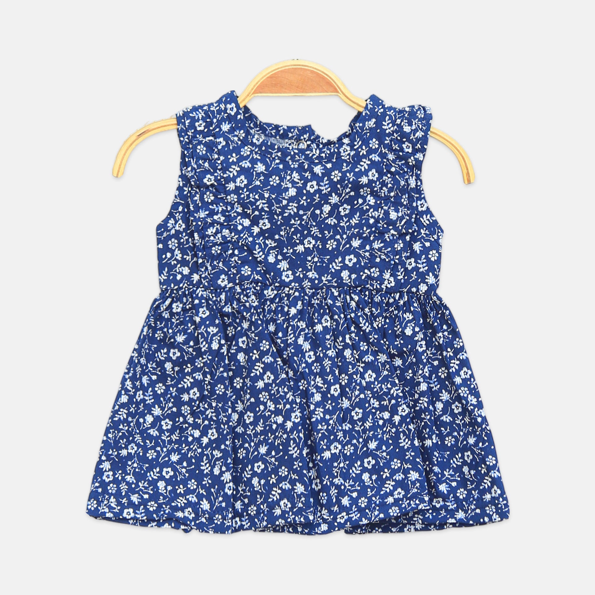 Dress: Sleeveless navy dress with an all-over white floral print.