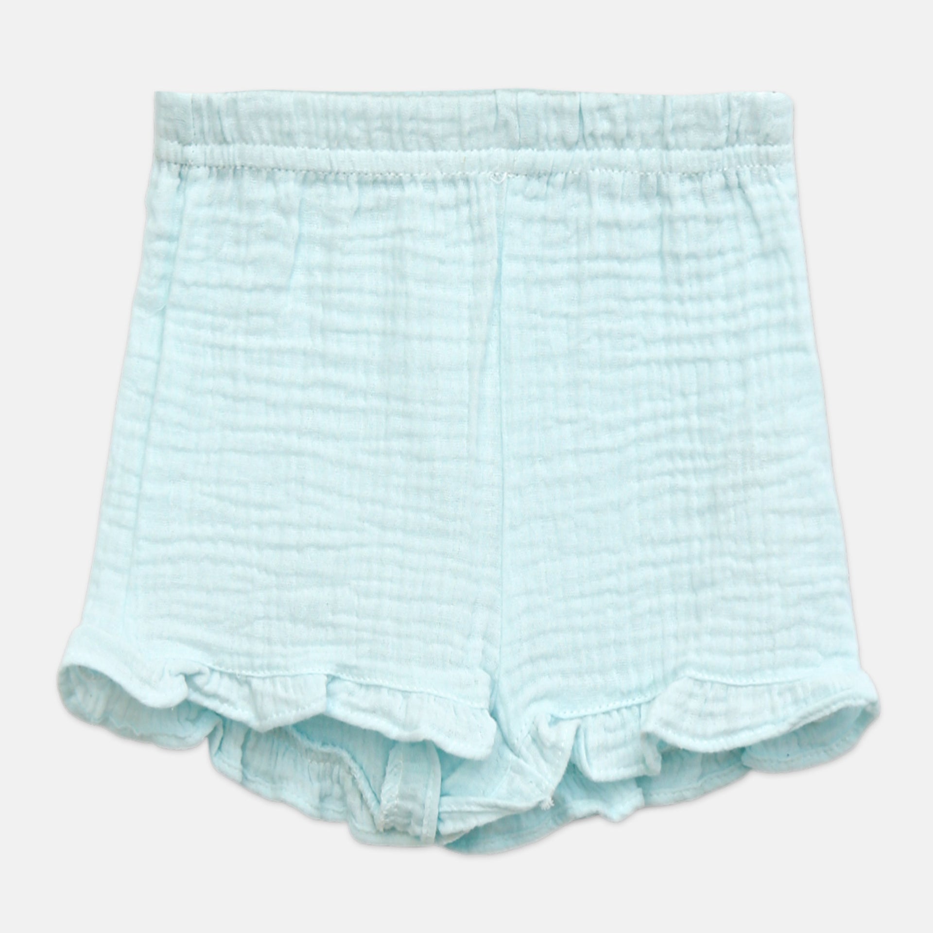 Bottom: Solid mint green shorts featuring a vertically ribbed texture and ruffled leg openings.