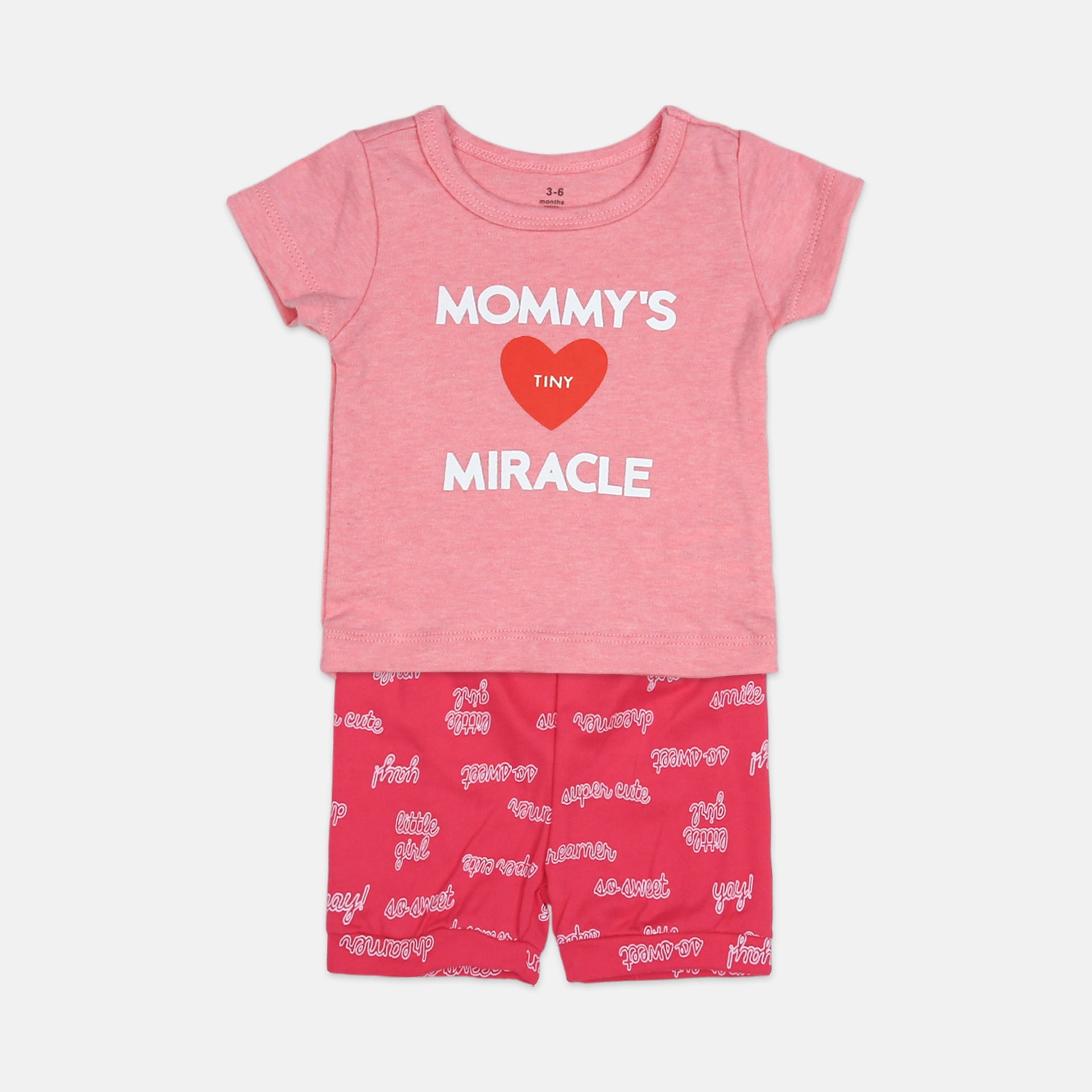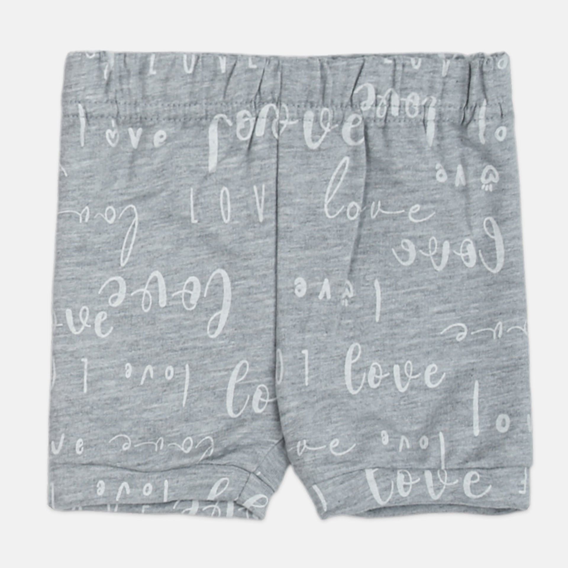 Playful Patterns: Includes gray and coral pink shorts with all-over text prints.