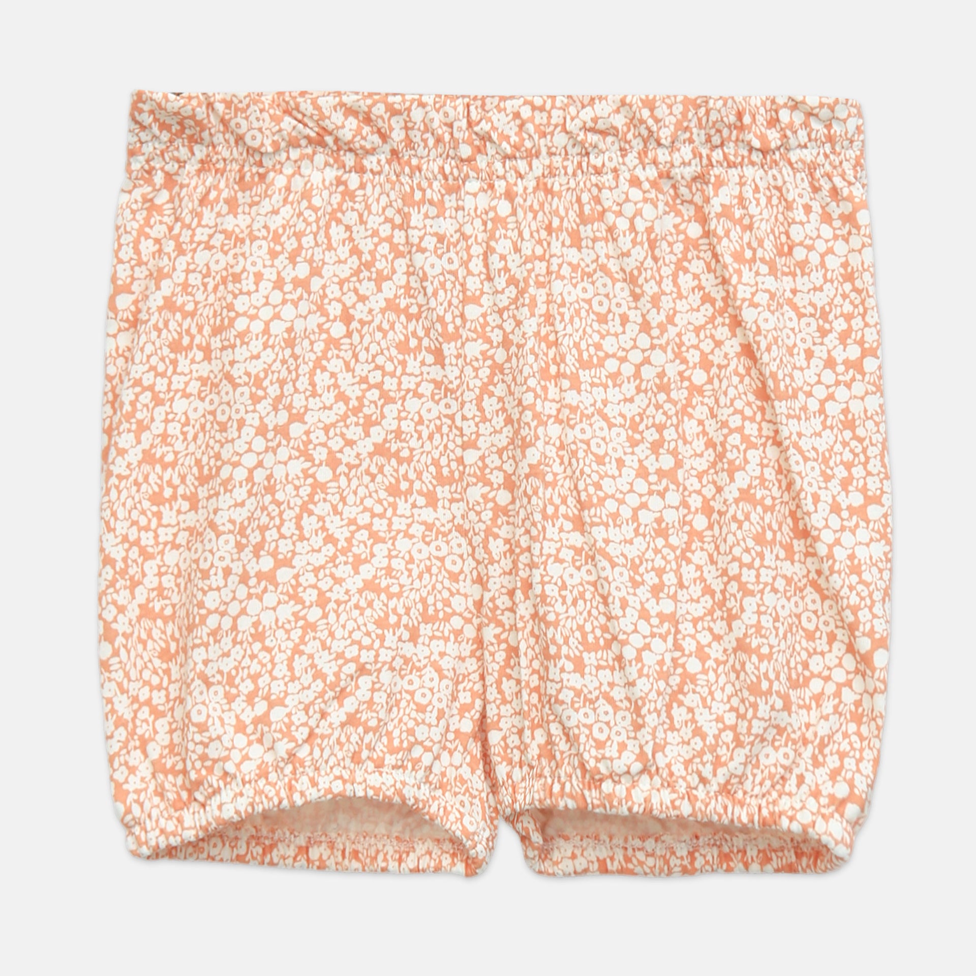 Shorts: Matching peach bloomers with a delicate all-over white floral print.