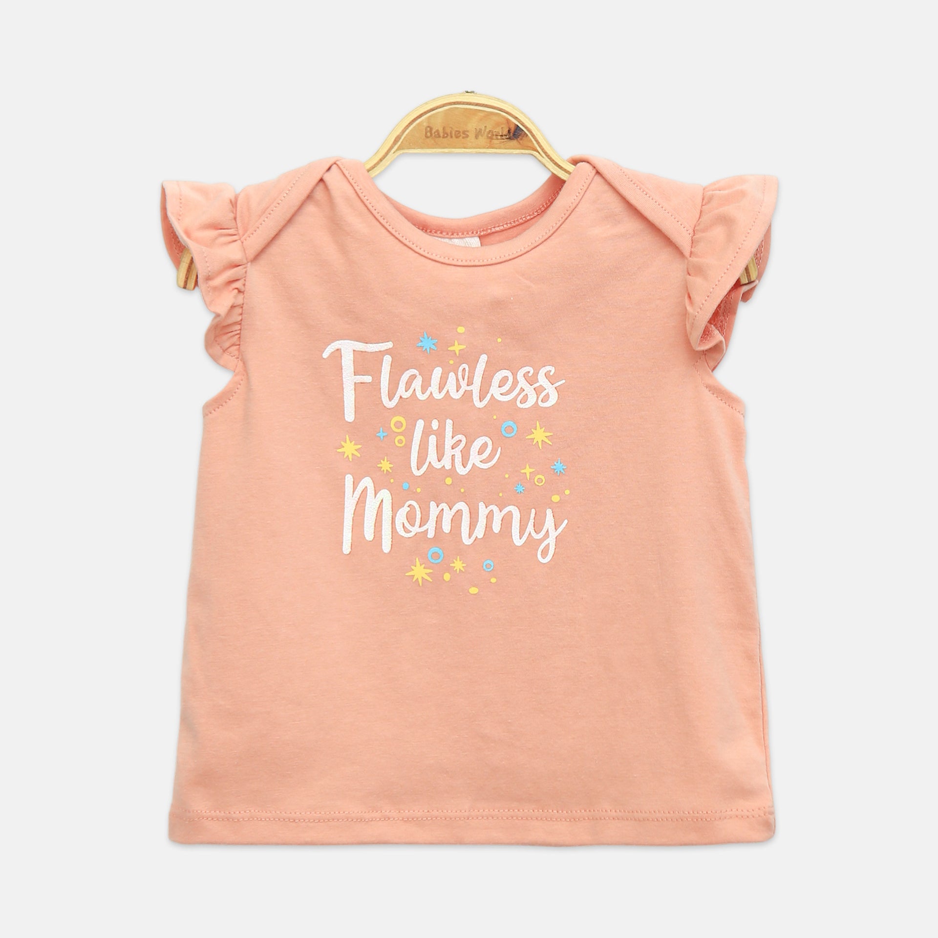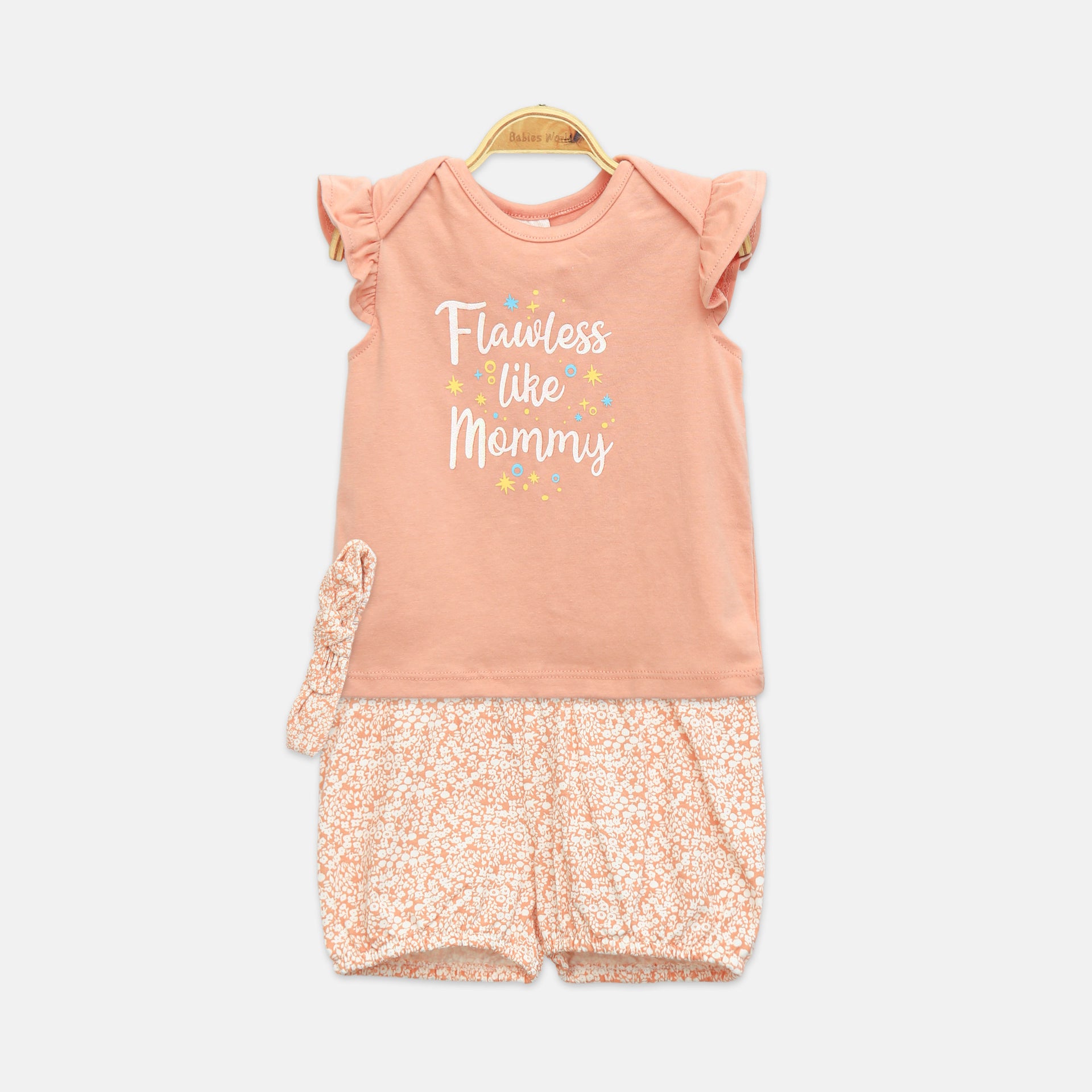 Top: Dark peach short-sleeve romper with "Flawless like Mommy" graphic.
