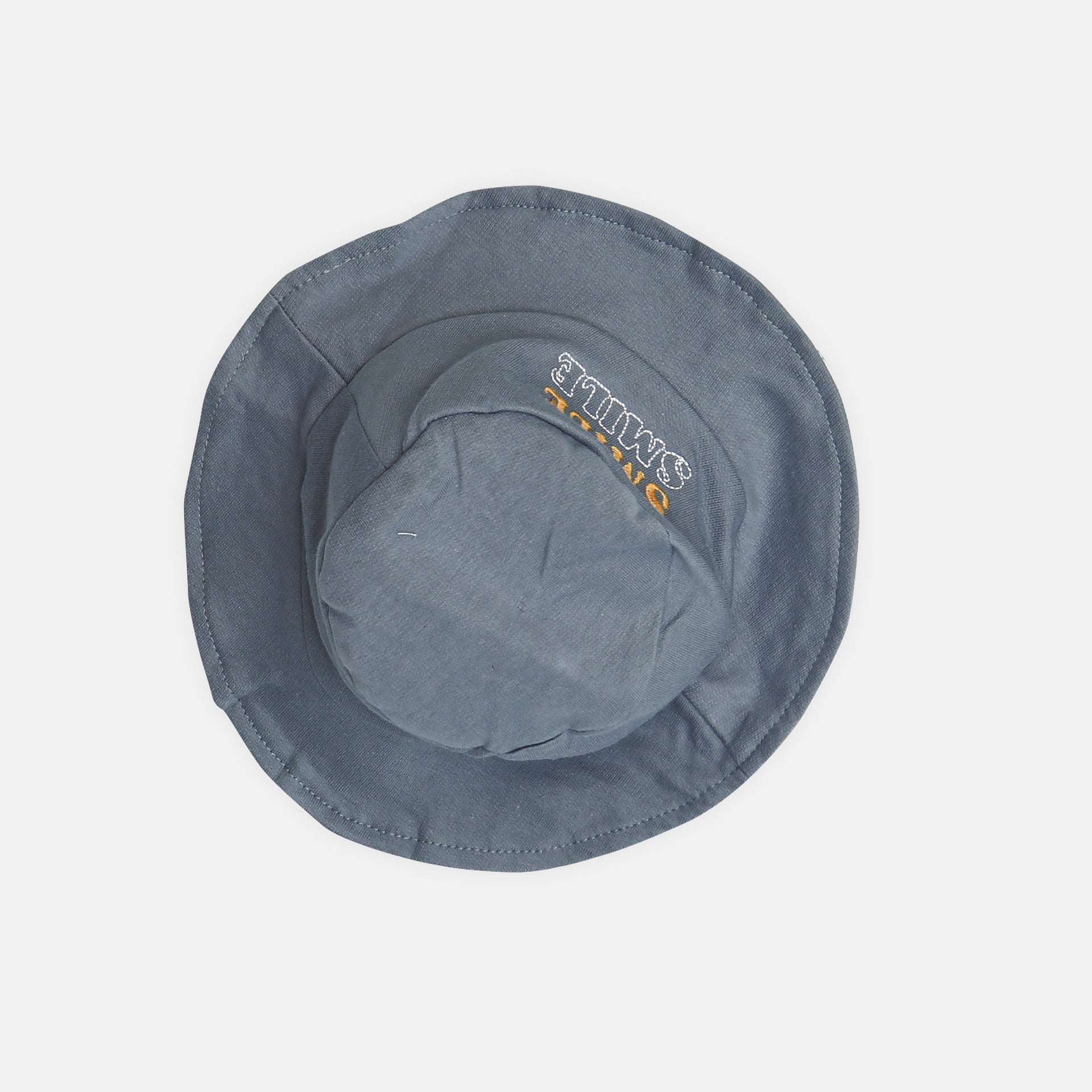 Detail: Solid grey overall-style romper with button straps and a "smile" text patch