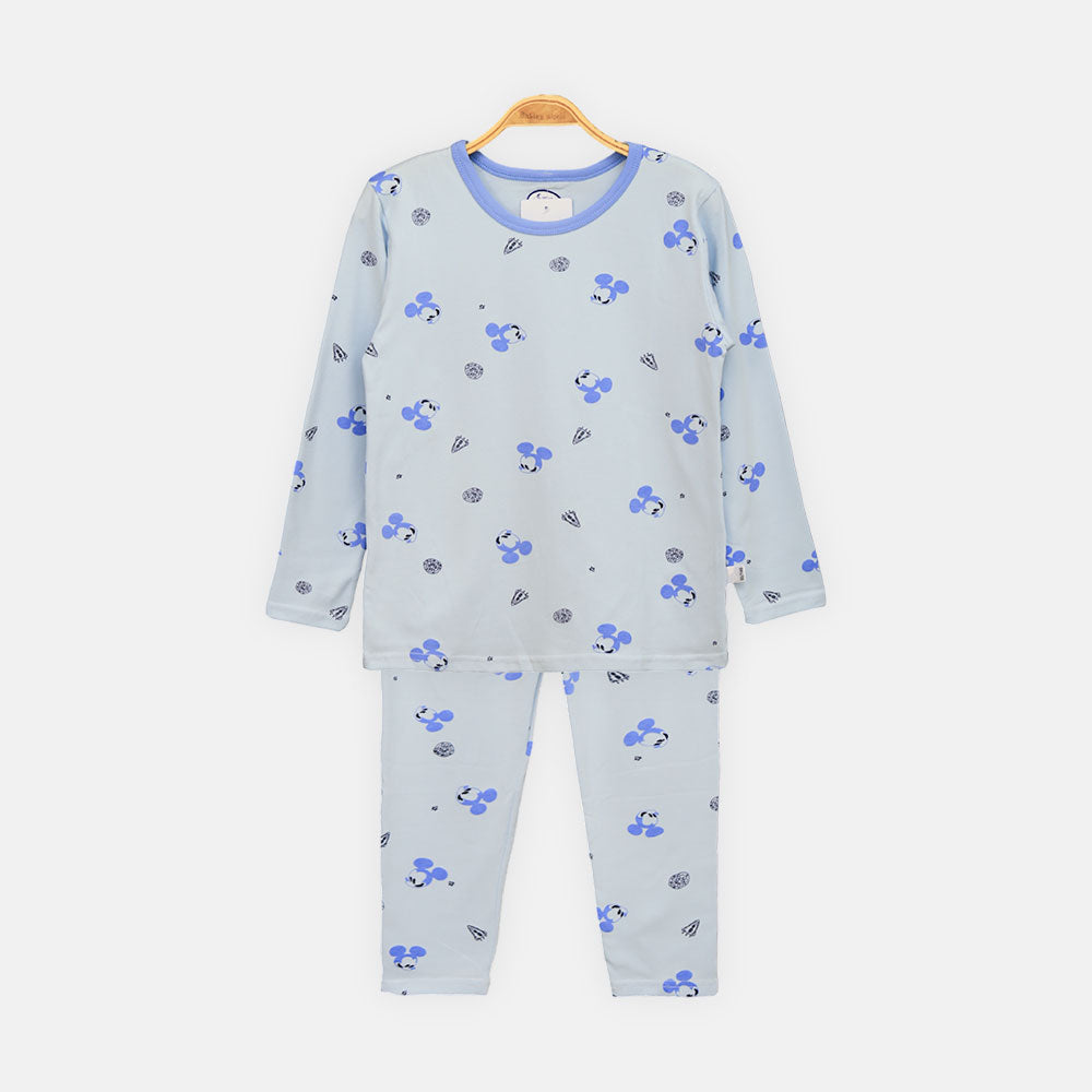 Two-piece pajama coordinate: light ice-blue long-sleeve top and matching full-length bottoms 100% breathable cotton jersey for a cloud-like feel and cozy all-night comfort All-over Mickey Mouse character print with fun space-themed pizza and rocket icons Contrast purple ribbed neckline and elastic waistband for a secure, stretchy fit High-quality, machine-washable fabric that keeps its shape and soft texture
