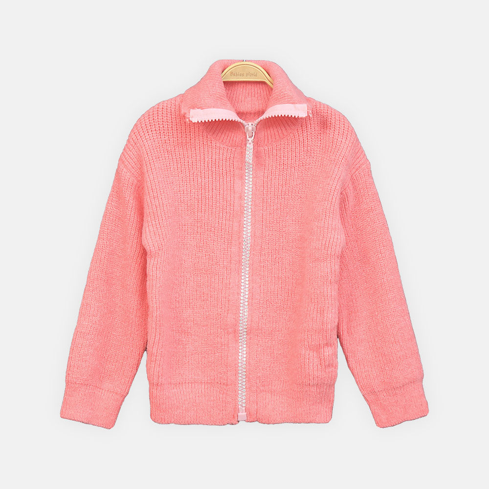 Girls’ glittery pink woolen jacket with high neck, rhinestone zipper, and cozy knitted fabric. Sparkly, stylish, and warm!