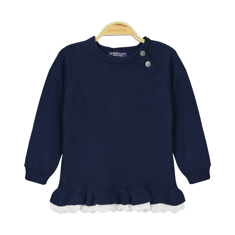 Details: A cute sweater featuring a neatly knitted body with button fastening near the neckline, ruffled hem embellished with a net lace to cozy up the new season looks.