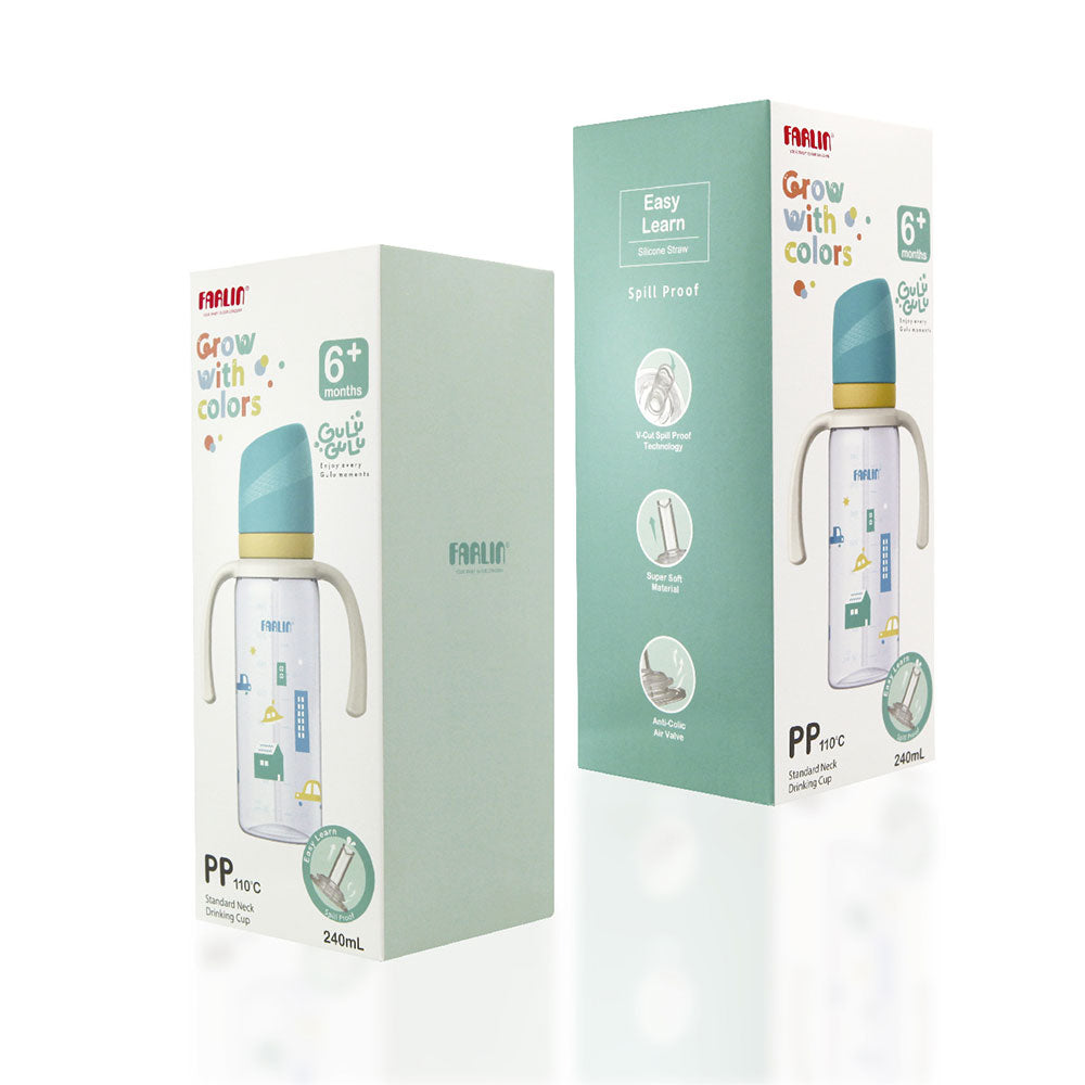 Help your baby transition from bottle to cup with ease. The Farlin Sipper Cup comes in a transparent body with a blue cap, designed with a soft silicone straw and spill-proof technology to make every sip gentle, safe, and mess-free. Its ergonomic design is perfect for little hands, while the anti-colic air valve ensures a comfortable drinking experience.