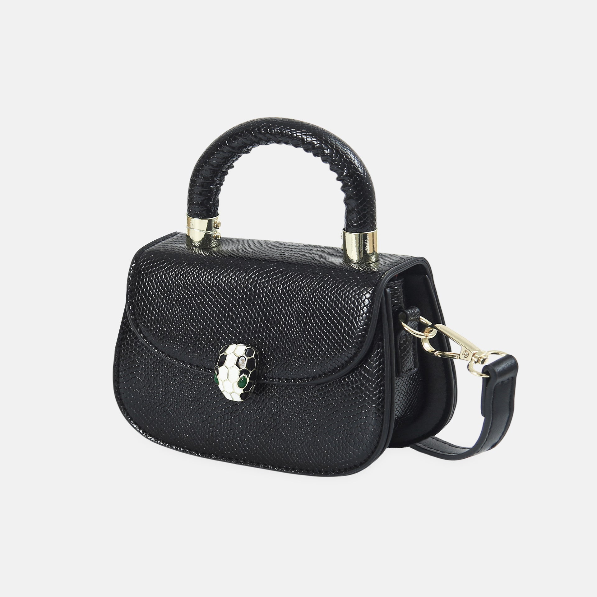 Clean black textured finish with a unique braided top handle. Designed with a secure front clasp and gold-tone details for a polished, feminine look. Ideal for pairing with light, airy summer dresses.