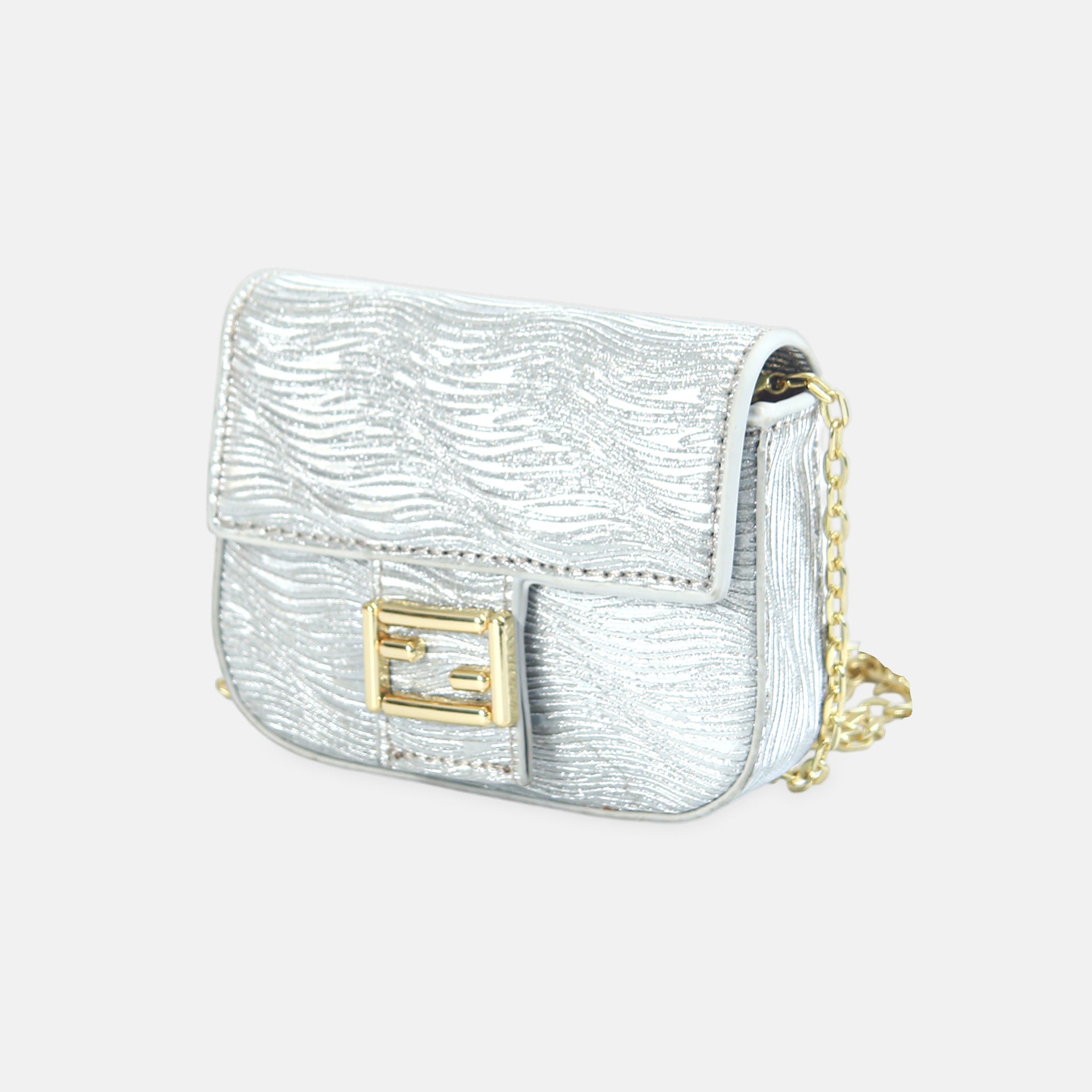 Feature: Reflective silver texture with a bold hardware centerpiece.