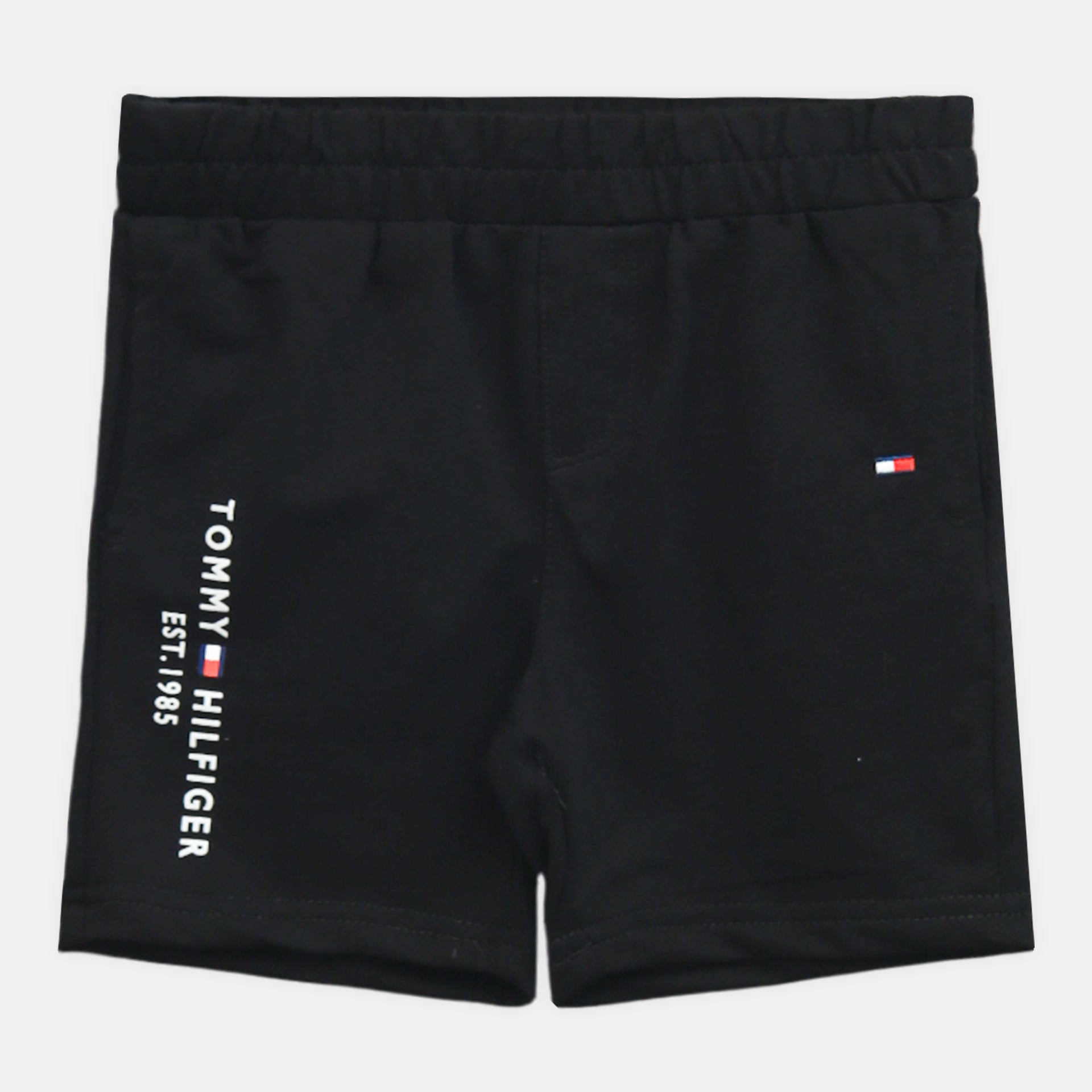 Shorts: Black jersey shorts with an elastic waistband and "Tommy Hilfiger Est. 1985" printed on the leg.