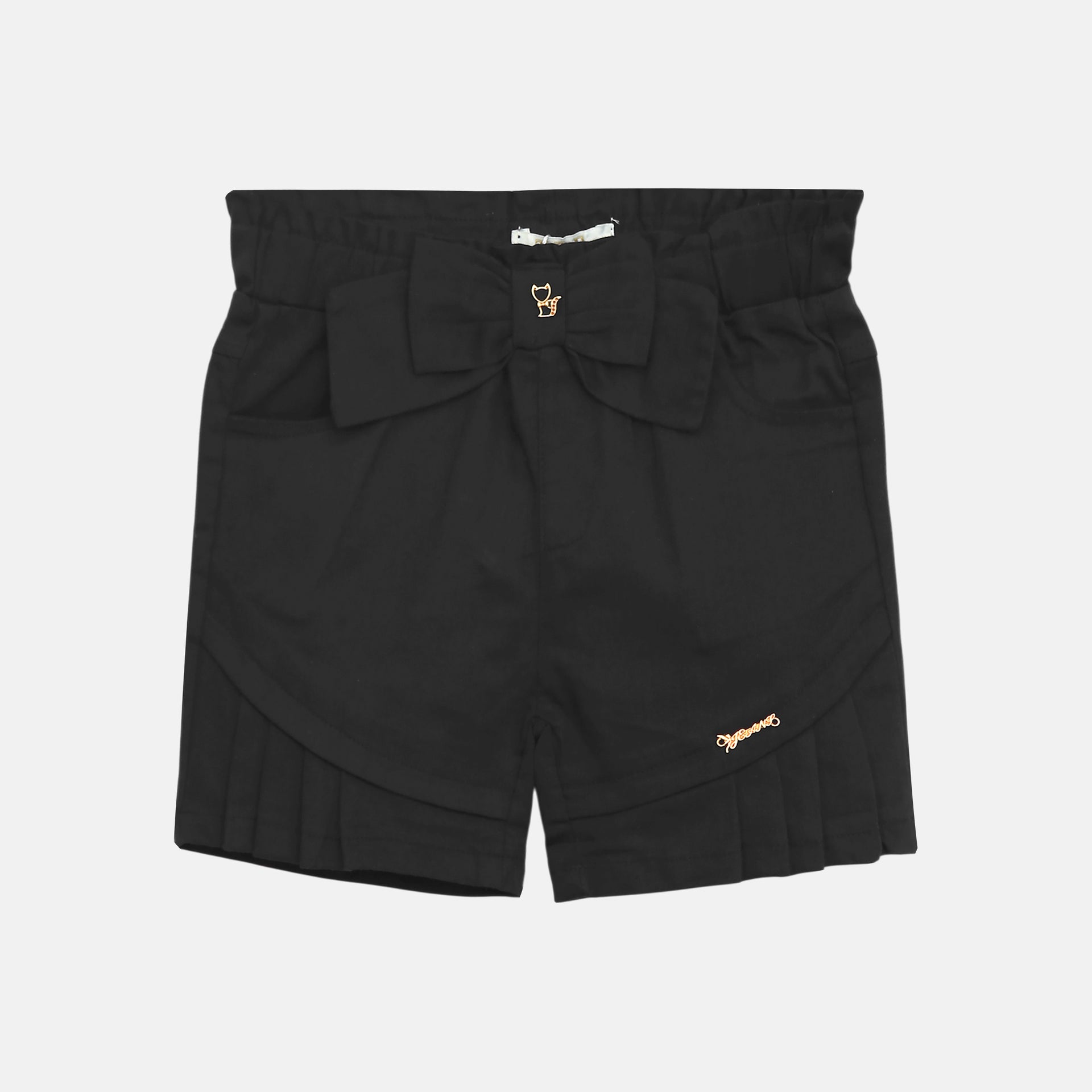 Feature: Small metallic hardware accent on the lower left leg