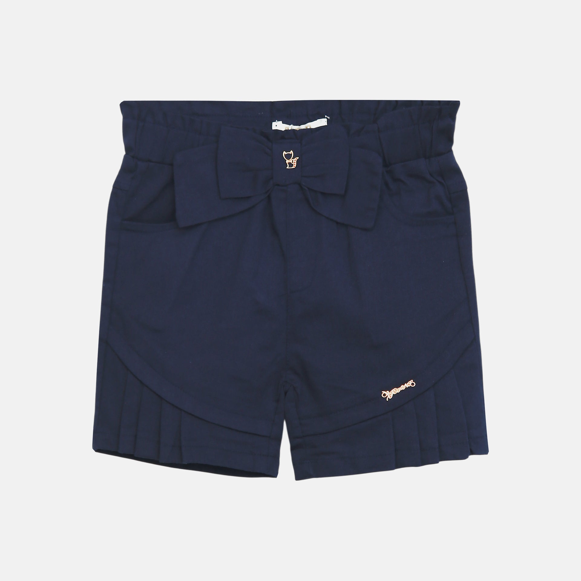 Detail: Large matching navy fabric bow at the waistband