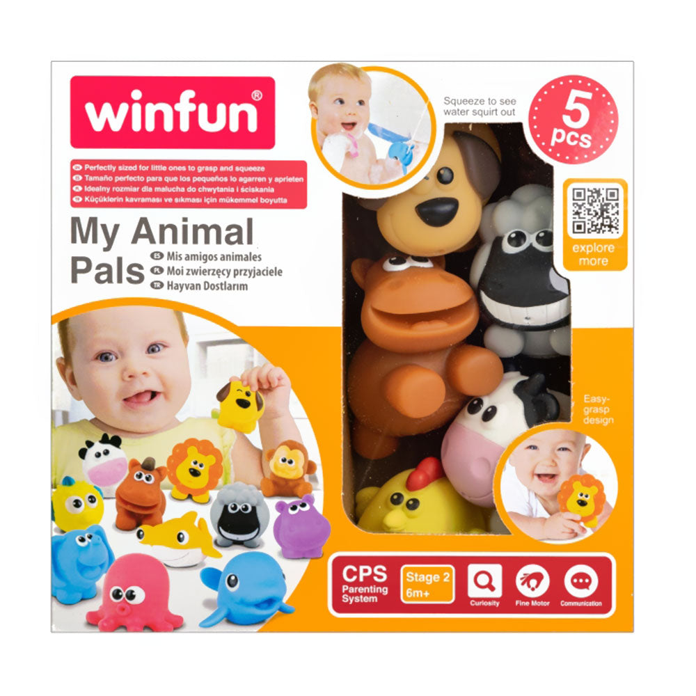 5 cute farm animals: a dog, a cow, a chicken, a horse and a sheep. The animals are easy for your baby to grab and play with. They will entertain your child at home, on a walk and when travelling. They will make every bath more pleasant.