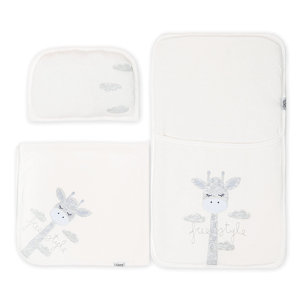 Detailing: A cute 3-piece sleeping set featuring a giraffe on a tiny pillow, a comfy quilt, and a cozy sleeping bag with fine threadwork detailing for the perfect look.