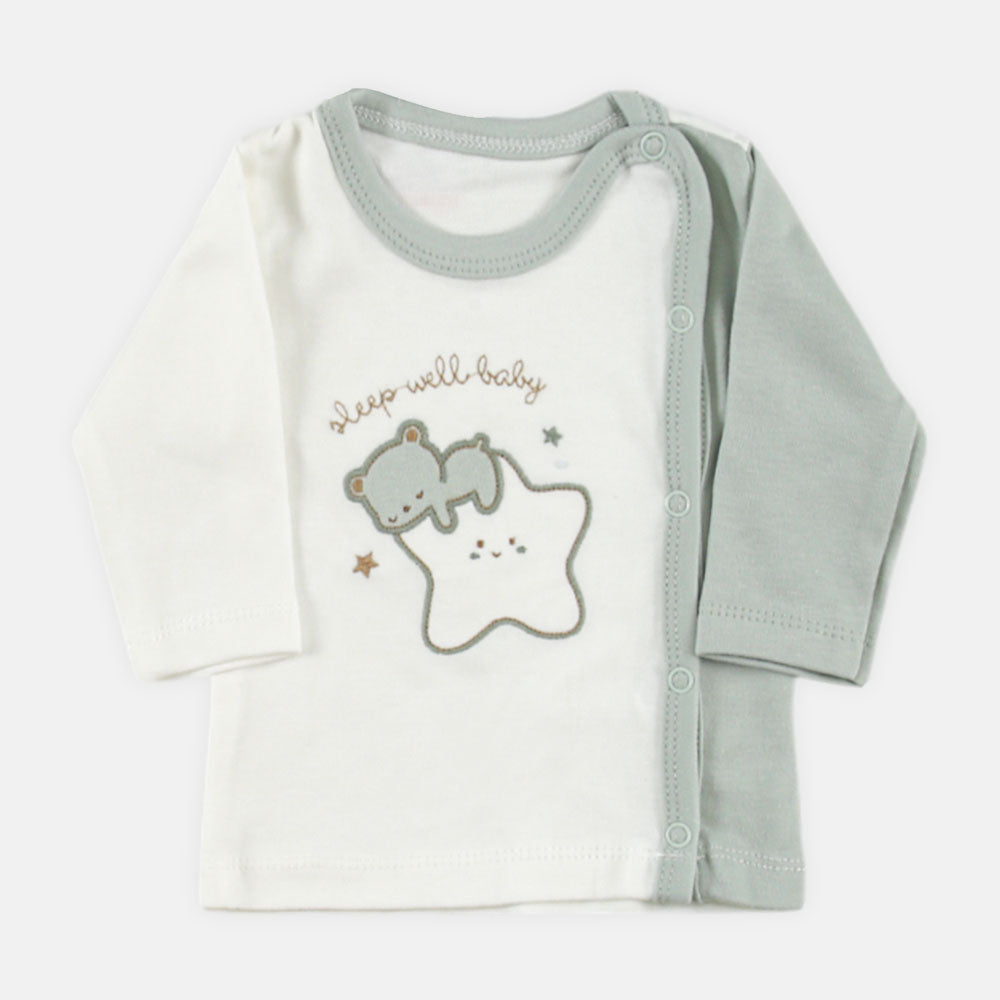 Easy changes with side-snap shirt, featuring a bear and star design. Pull-on pants with elastic at the ankles.