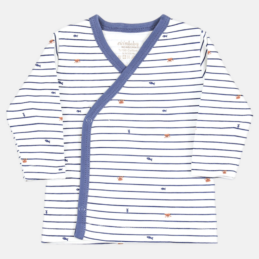 Wrap-around long-sleeve top with side snaps (striped blue & white)